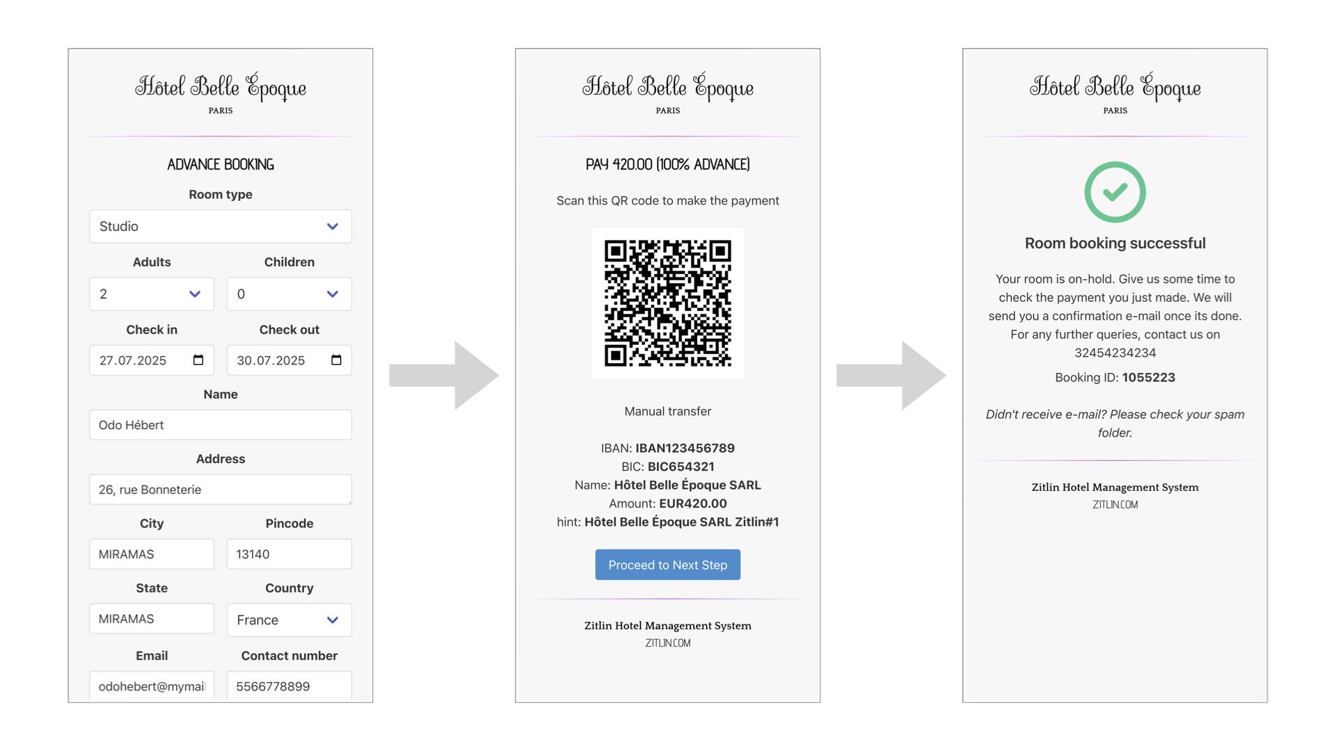 - Your hotel's full bank details (IBAN, BIC, and bank name) are clearly displayed on the booking confirmation page and email.